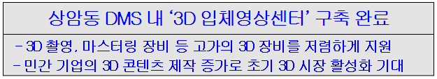 문화체육관광부(장관 최광식)와 한국콘텐츠진흥원(원장 이재웅)은 2010년부터 2011년 12월까지 국고 53억 원을 투입, 상암동 DMS 내에 ‘3D 입체영상센터’ 구축을 완료했다.