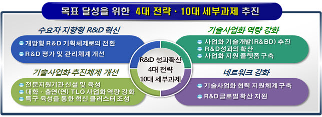 o 동 계획은 R&D 성과가 창조경제를 꽃피울 수 있도록 △수요자 지향형 R&D 혁신, △기술사업화 역량 강화, △사업화 추진체계 개선, △네트워크 강화 등 4대 전략과 이를 실현하기 위한 10대 세부과제를 설정하였다.