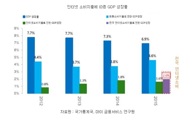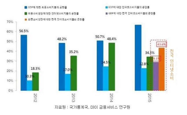 - 경제성장이 둔화됐음에도 2015년 GDP에서 소비가 공헌하는 비율이 66.7%를 차지했고, 그 중 중국 전국의 인터넷 소비지출이 GDP 공헌비율의 29.1%를 차지했음.