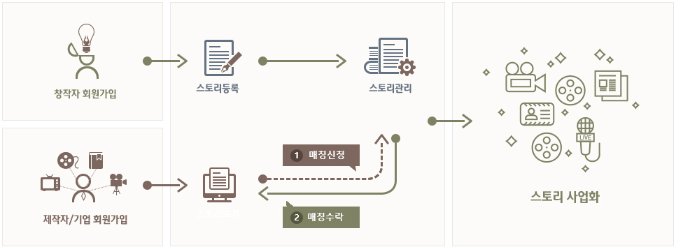 그간 ‘이야기’* 창작자들은 구직, 계약 체결 등을 스스로 해결하거나 선배, 지인 등의 ‘알음알음 네트워크’**에 의존해왔다. 고립된 창작 환경은 창작 자의 생활고를 야기함은 물론, 좋은 아이디어가 사장되는 결과를 가져와 콘텐츠산업의 기초체력을 약화시키는 고질적인 문제로 지적되어 왔다. 이에 정부는 이야기 산업의 수요-공급 불균형을 해소하고 상시적인 신인 등단 경로를 마련하기 위해 누구나 쉽게 접근할 수 있는 플랫폼을 구축하기로 했다.
