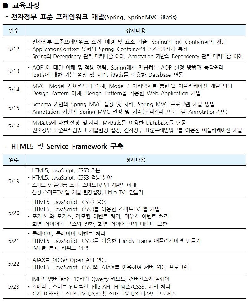 목포시 석현동 소재 목포벤처지원센터에서 진행되는 이번 교육은 삼성SDS 멀티캠퍼스와 협력하여 진행되며 사전모집을 통해 총 40명의 교육생을 선발한다. 교육생 선발 후 오는 12일과 19일부터 각각 5일간 운영되며, 주요 교육내용은 ▶‘사례로 배우는 전자정부 표준 프레임워크 개발 역량 강화’ 과정, ▶‘스마트TV앱 개발을 위한 HTML 5 및 Service Framework 구축’ 과정 등이다.