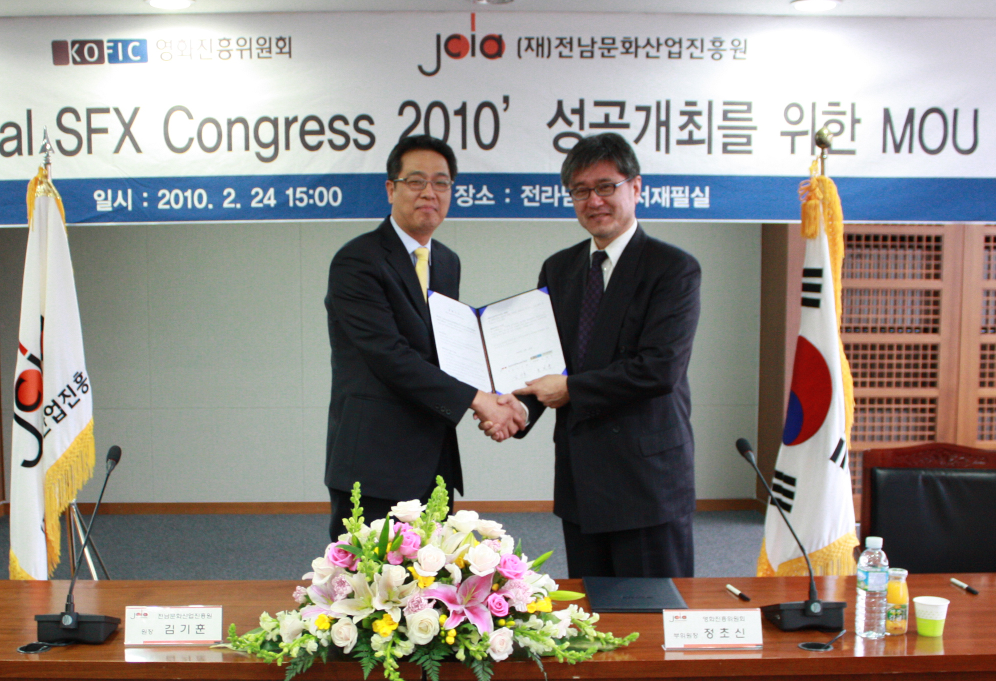 지난 2월 24일에는 영화진흥위원회(위원장 조희문)와 진흥원 간 양해각서(MOU) 체결식을 가졌다. 협약의 주요내용은 전남의 영상산업 진흥 및 SFX분야 활성화, SFX 콩그레스 성공개최를 위한 업무협조 등을 담고있다. 전국 대학 이미용학과의 20%가 분포하는 전남의 경우 이번 MOU를 통해 특수분장 분야의 교육인프라와 지원시스템을 마련할 수 있는 계기가 될 것이다. 또한 SFX 콩그레스를 중심으로 장기적으로 전남 영상산업분야 진흥을 위한 밑거름이 될 것으로 보인다.