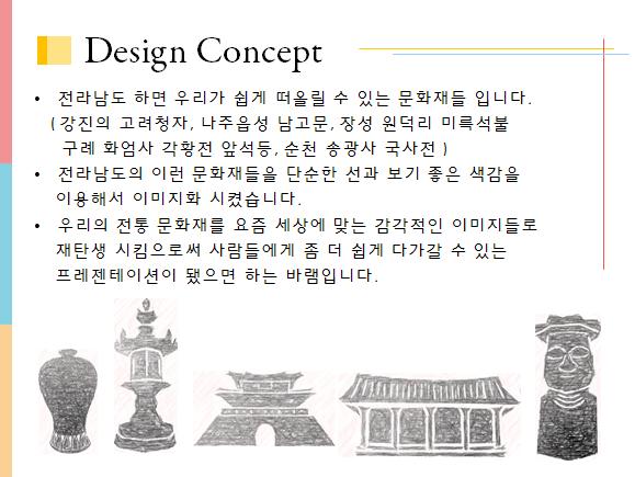 공모된 작품을 면면히 살펴보고 싶었으나 아직 심사가 진행 중인 관계로 담당자를 통해 접수된 작품에 대한 이야기를 잠깐 들어 보았습니다. 이번 공모전은 템플릿 작품이 다수를 차지하고 있으며, 여수 엑스포, F1 등 전남의 국제 행사와 관련된 작품과 전통과 문화재를 소재로 한 작품들이 눈길을 끌었습니다.