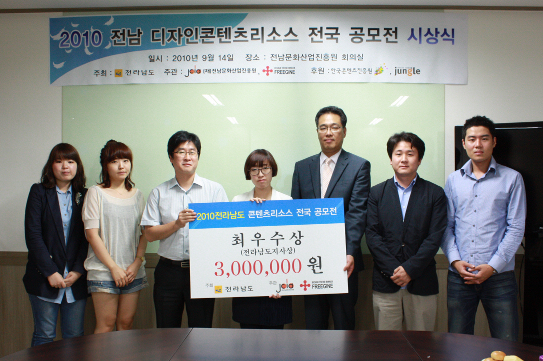 영예의 최우수상은 조민혜씨의 <다도해 전남>이 선정되어 전남도지사상과 상금 300만원이 수여되었다. 그 외에 이형진씨의 <여수 국제 SFX 콩그레스>, 김태훈씨의 <천연염색> 등이 우수상으로 선정되었다. 시상식은 지난 9월 14일 진흥원에서 수상자 8명이 참가한 가운데 진행되었다. 최우수상을 포함한 수상작 18점은 공모전 공식홈페이지(www.designjn.com)를 통해 확인할 수 있다.