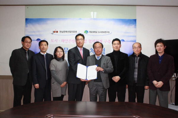 전남문화산업진흥원과 목포대 도서문화연구원은 지난 12월 14일 전남의 도서?해양 콘텐츠 개발 활성화를 위해 상호협력하는 내용의 업무협약 체결식을 가졌다.