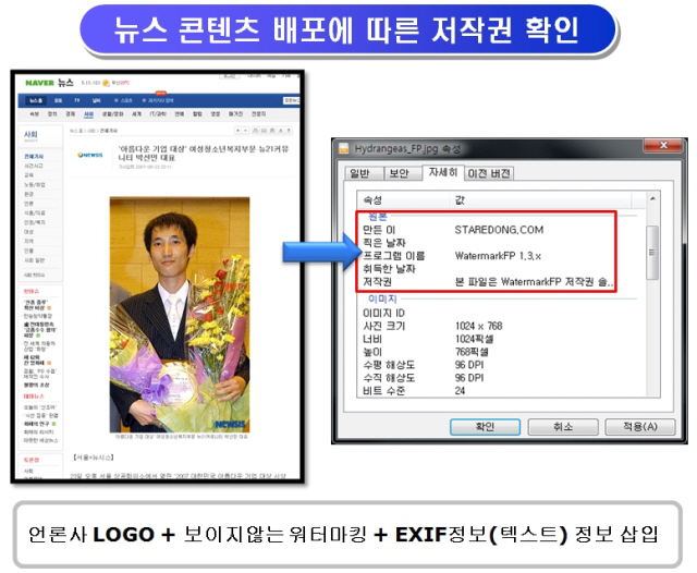 - 특성 : 제작된 콘텐츠에 다양한 형태의 저작권 정보를 삽입하여 국내 URL(Uniform Resource Locator)기반의 90% 이상을 실시간 추적, 모든 게시물 내에 ‘WatermarkFP’ 의 저작권정보 확인을 통한 불법콘텐츠 적발 및 저작권 관리