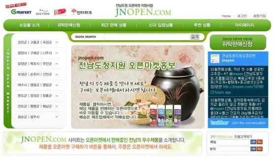 - 전남 우수중소기업 오픈마켓 위탁사업 : ‘JN오픈마켓(www.jnopen.com)개설을 통한 전남 우수 중소기업의 컨설팅, 농수산물과 공산품 광고,홍보 및 위탁판매