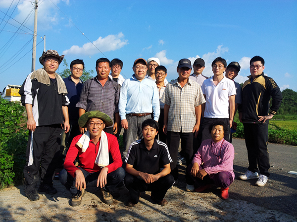 ▶ 진흥원 김영주 원장과 임직원들이 일손 돕기를 마치고 김형수 이장과 함께 기념 촬영을 하고 있다.