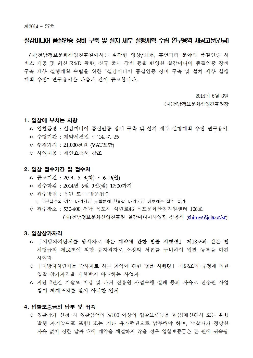 [공고 2014-57호]실감미디어 품질인증 장비 구축 및 설치 세부 실행계획 수립 연구용역 재공고(긴급)