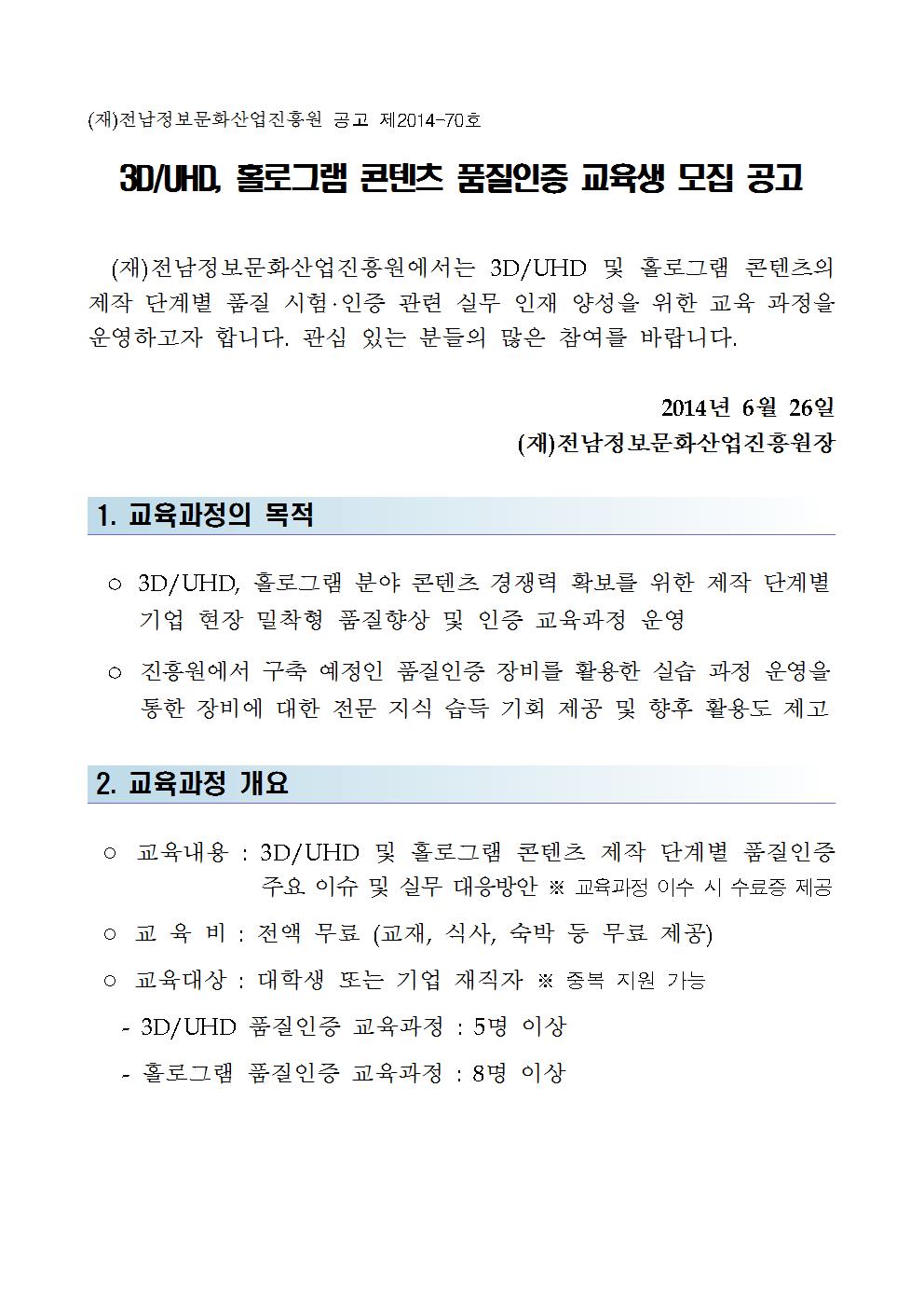 [공고2014-70호] 실감미디어 품질인증 교육생 모집 공고