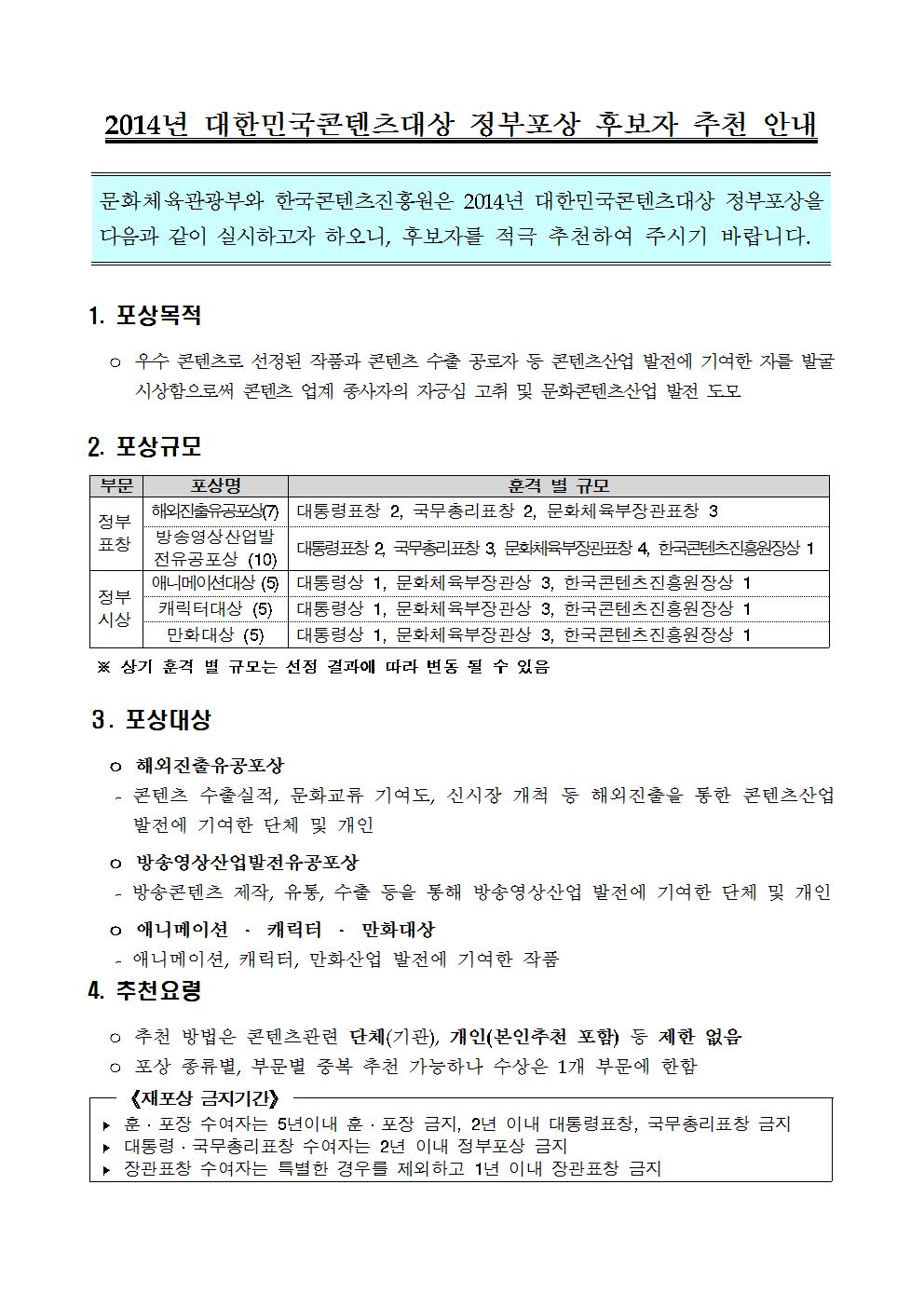 (안내) 2014년 대한민국콘텐츠대상 정부포상 후보자 추천 안내