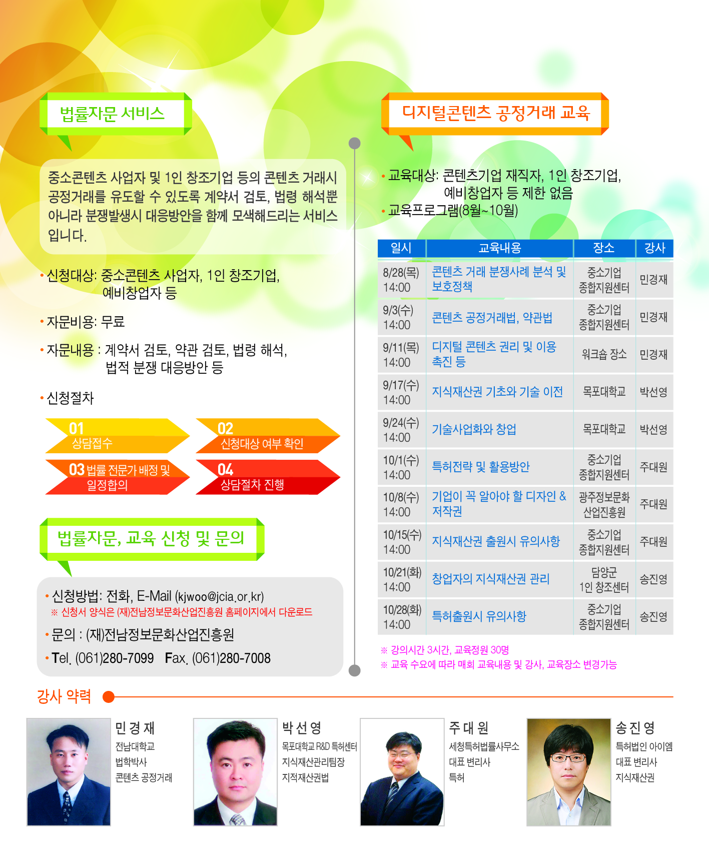 (재)전남정보문화산업진흥원에서는 디지털 콘텐츠 공정거래 교육생을 모집하오니, 뜻이 있는 분들의 많은 신청바랍니다.